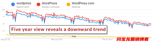 例如,回顾一下五年来关于搜索词WordPress(建站平台)、WordPress软件和WordPress.com网址的趋势: